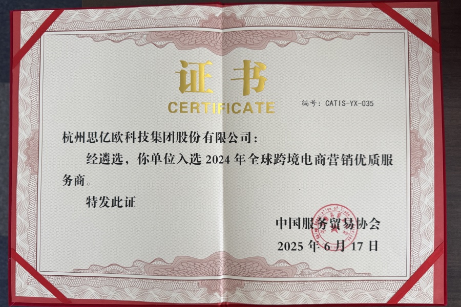 2025年6月17日,“世界跨境电商发展大会”在廊坊召开。2025世界跨境电商发展大会由世界贸易网点联盟、英中商业发展中心、中国服务贸易协会共同主办,由中国跨境电商50人论坛、中国服务贸易协会电子商务专业委员会共同协办。杭州思亿欧科技集团股份有限公司受邀出席2025世界跨境电商发展大会,并入选为2024年全球跨境电商营销优质服务商。